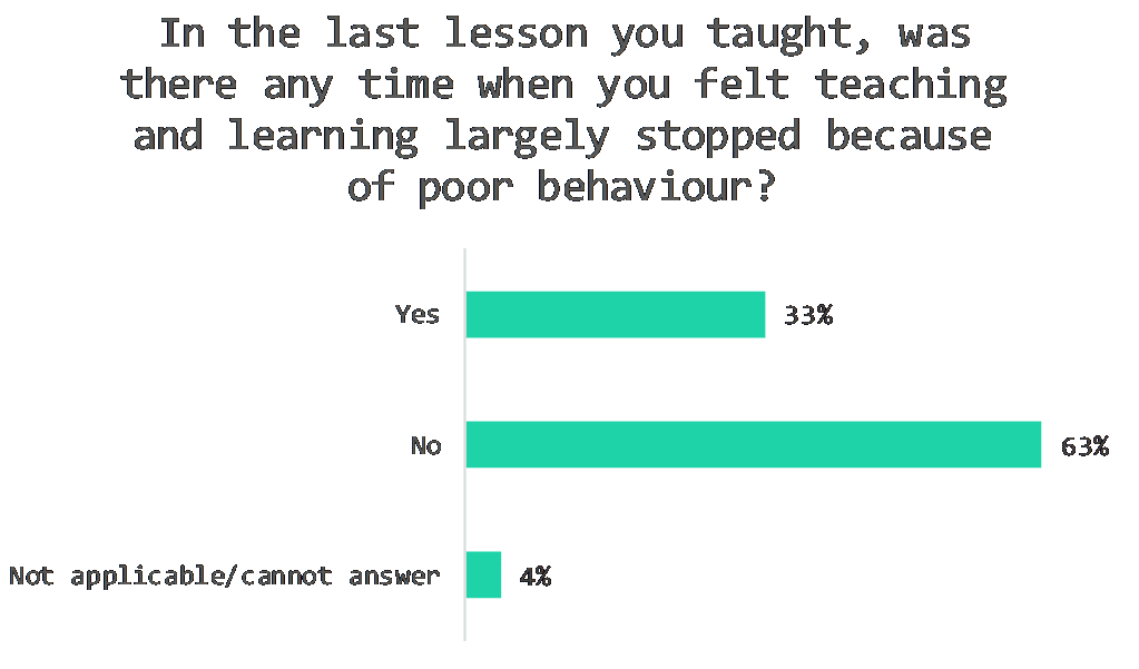 As part of our ongoing quest to investigate behaviour problems we asked teachers about the level of disruption in their last lesson. The results were pretty positive, with only 33% saying yes. (This is slightly lower than last time we asked).