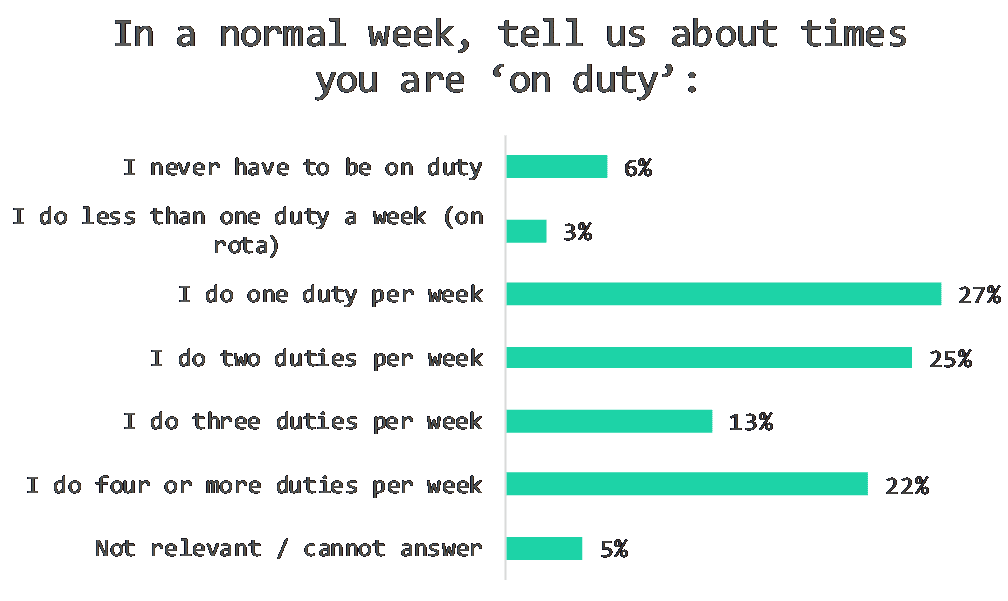 This week we also discovered that 60% of teachers are expected to be ‘on duty’ at least twice a week during non-lesson periods. A substantial proportion – 22% – said they do four or more duties. If you consider these are done during ‘down periods’ then no wonder teachers feel overwhelmed.