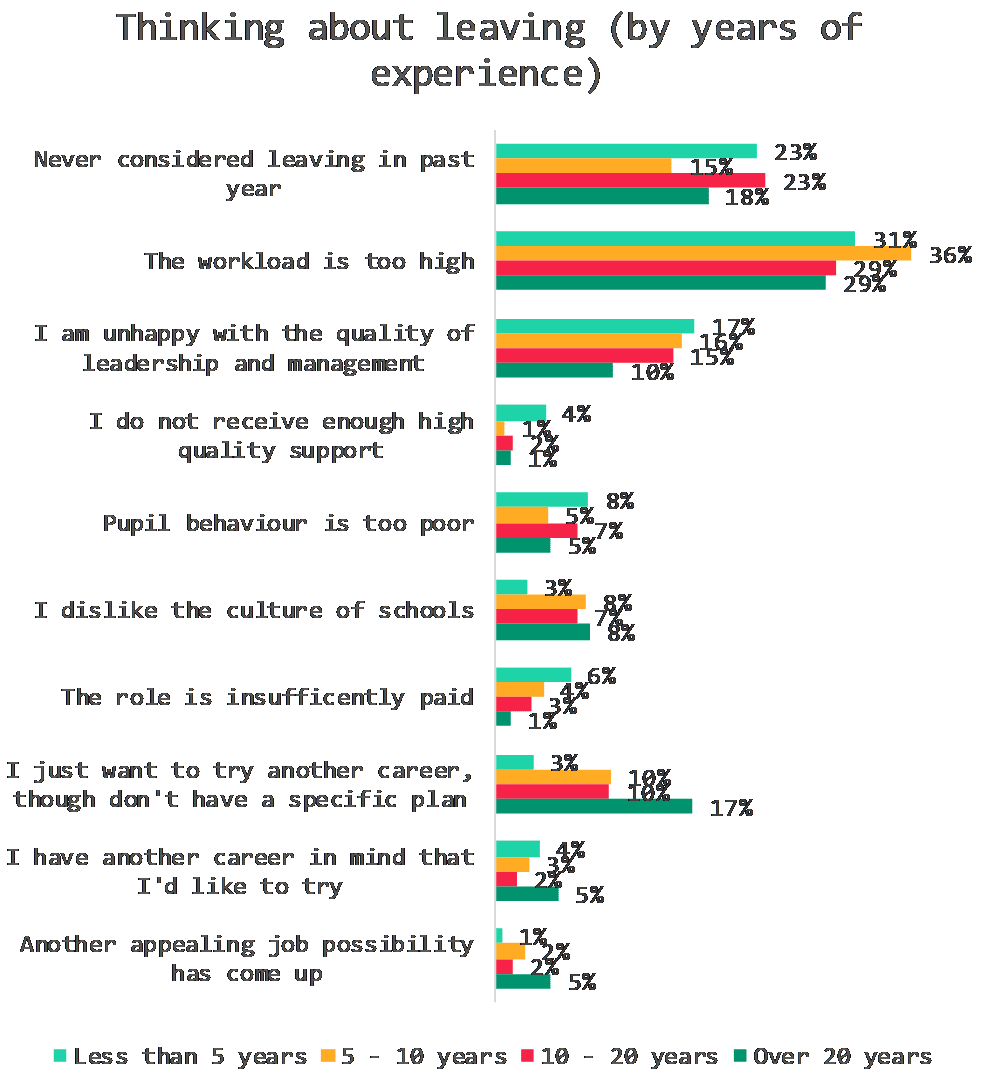 Teachers who have been in the profession for more than 20 years are much more likely to have said other jobs were attracting them away. Of course, they might also have said workload is too high, but it’s interesting they are so over-represented in these answers.