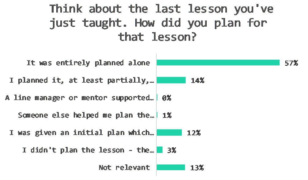 The majority of teachers (57%) are planning lessons on their own. Only 15% were given an initial plan (of which 12% adapted).