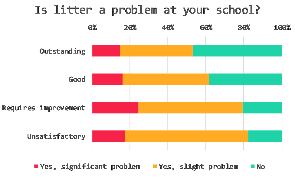 If you look at the green on the right-hand side, you can see the number of people who say litter is not a problem goes up with the rating of the school. Correlation or causation? We know what Mr Blacow would say!
