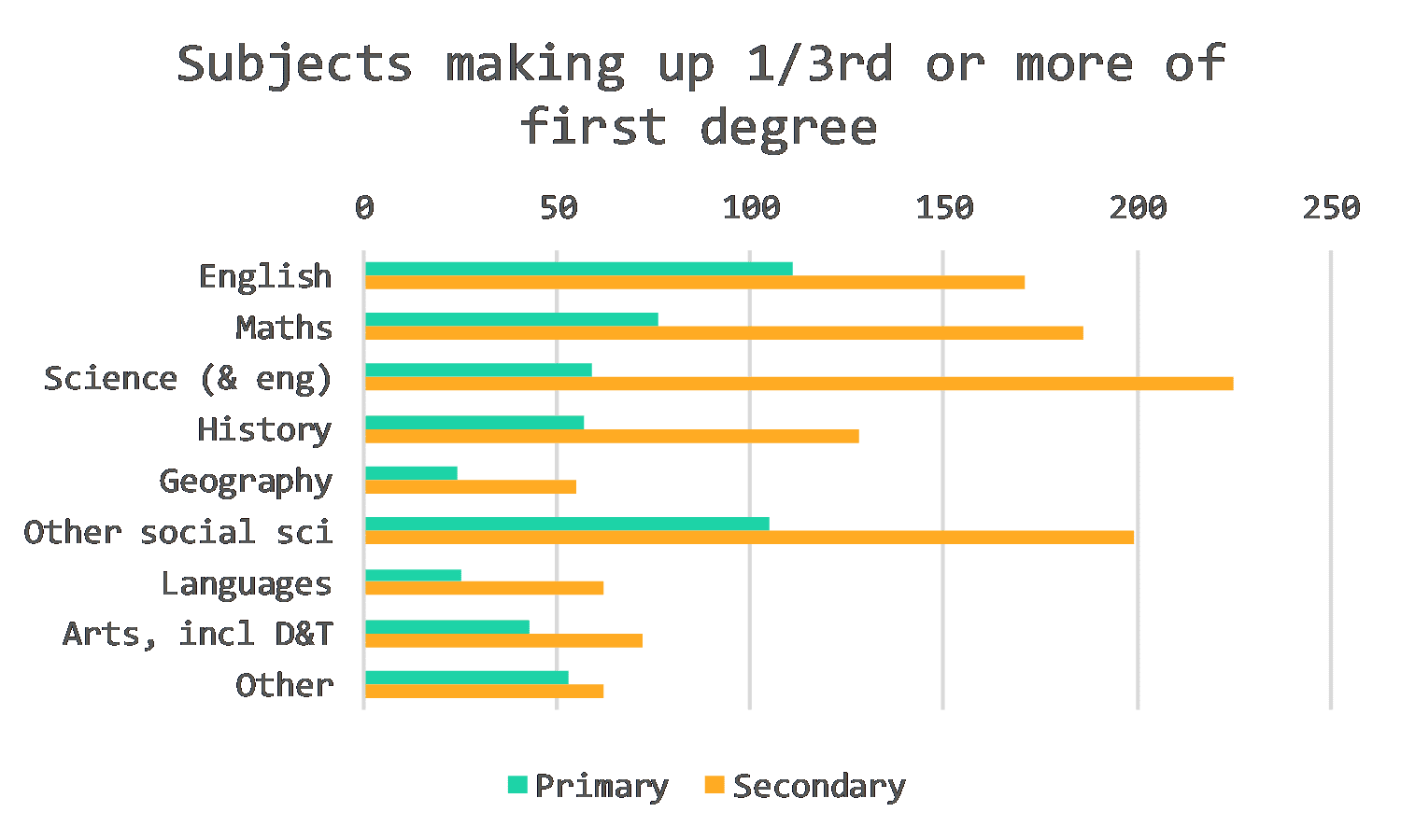 The biggest difference is that science dominates in secondary schools, followed by ‘other social science’; whereas English is the most dominant degree subject in primary schools (also followed by ‘other social sciences’)