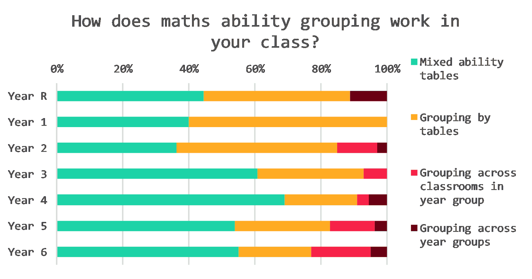 But how many schools sit pupils by ability from being very young? We asked specifically about maths and found a divide. At Key Stage 1, around 60% of schools tend to group pupils by ability on their tables (and 40% don’t). By Key Stage 2 this changes slightly and around half of teachers have mixed ability groupings, and around half sit them with people who are alike (either on their tables, or by mixing with other classes/years).