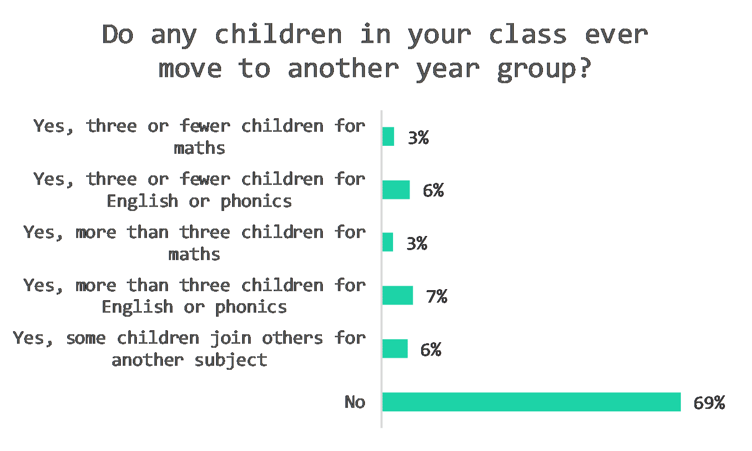 We were also interested in the flexibility for children to move across year groups. In general, teachers said their children never move to another year group for any of their teaching (69%). A small percentage of teachers had children move year groups for maths, English, or another subject.