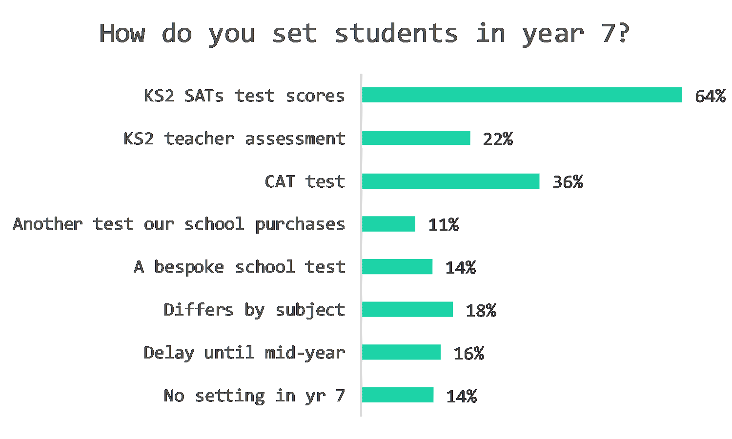 A whopping 64% of secondary teachers told us that Key Stage 2 tests scores affect the sets their year 7 students are placed into. A further 22% said key stage 2 teacher assessments are also included.