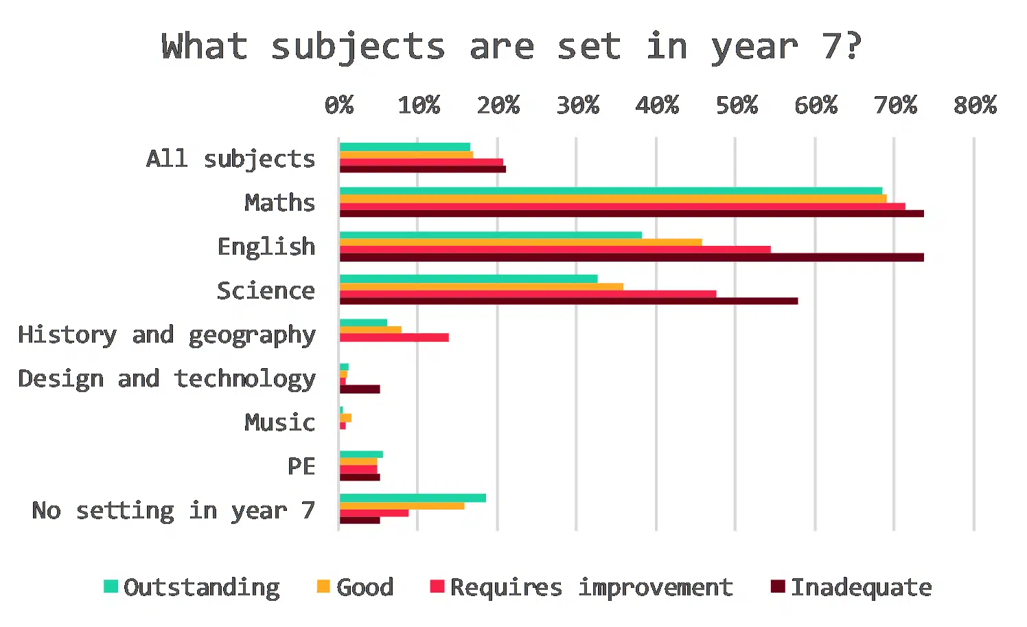 Teachers in inadequate schools reported they set by ability at much higher rates than those who taught in outstanding schools.