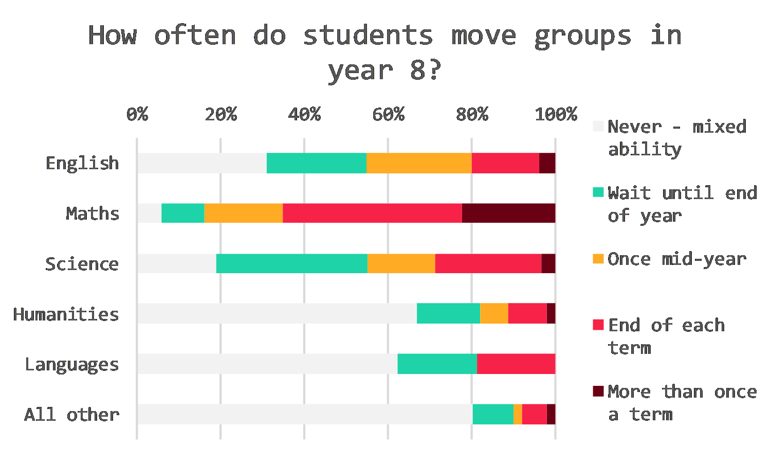Interested in knowing how often students were able to move between classes, we asked about year 8s this time, and found that over 60% of humanities teachers did not have any setting for their year 8s. In maths, however, over 90% of teachers said their pupils were set, and over 80% said children moved around at least once a the year. And, 20% of maths teachers said children in their subject move ability sets more than once per term. That is a lot of administration to sort out!