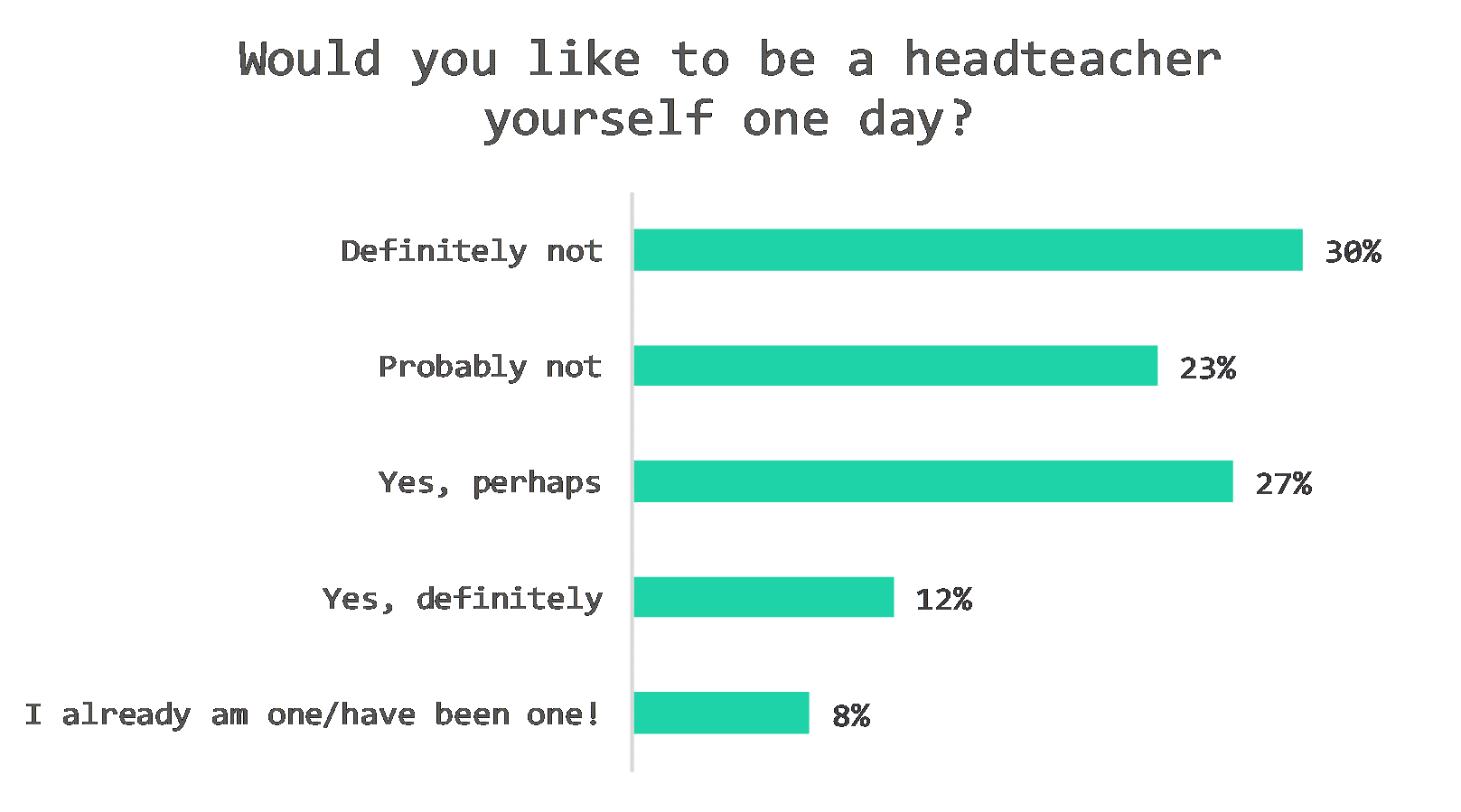 That said, 27% of panellists said they would consider it (‘yes, perhaps’) and 12% said they ‘definitely’ wanted to become a headteacher (which is about how many the system actually needs).>