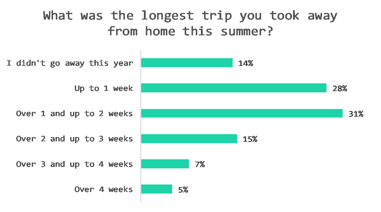 Most of you only go away on holiday for somewhere between 1 and 2 weeks. And 14% don’t go anywhere at all! Are those longer school days really worth it to keep the 6 week summer?>