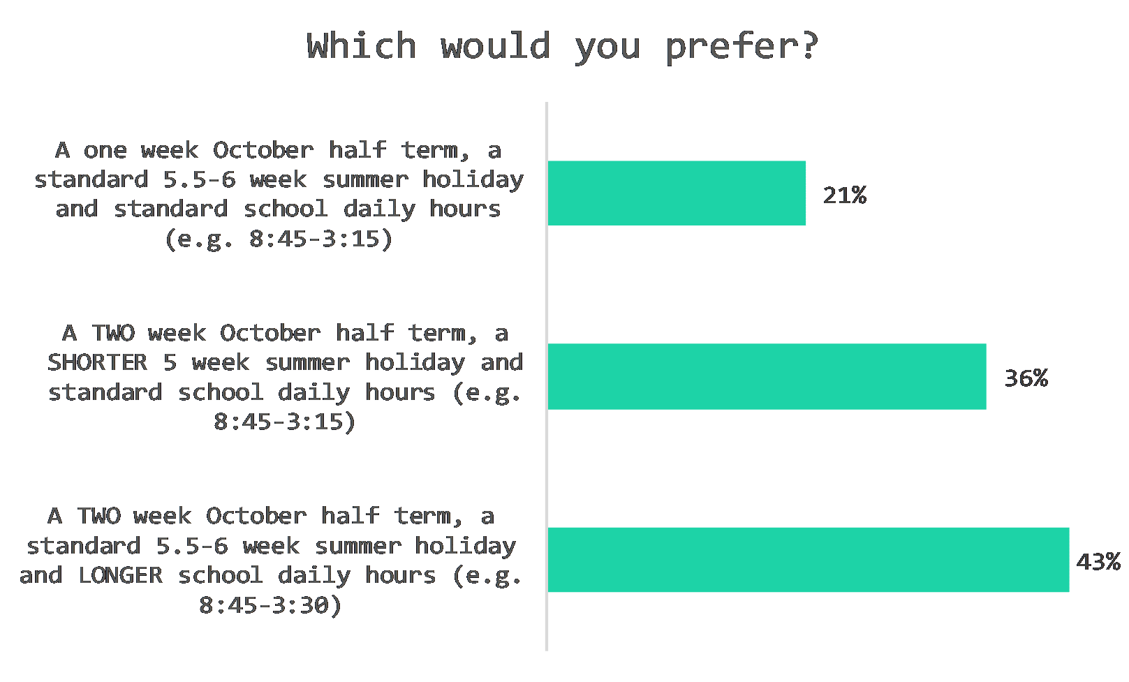 Yes, is the answer! Most teachers (79%) voted for a TWO week October half-term although they were divided over how to achieve it. A smaller proportion (36%) said they would choose shorter summer holidays, while more (43%) wanted a longer school day to make up for it. >