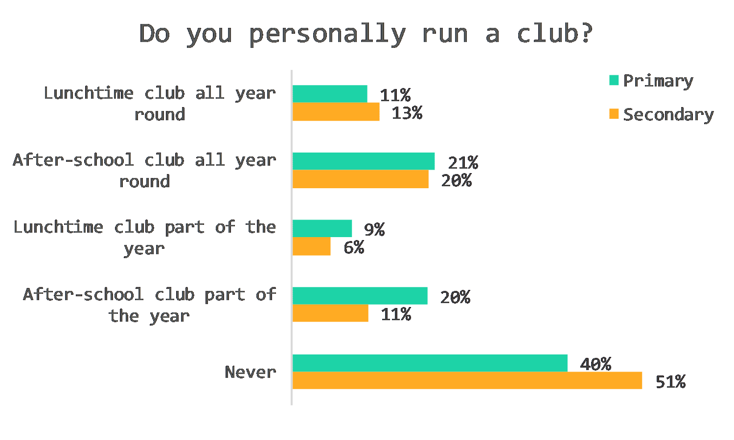 A whopping 51% of secondary teachers never run a lunchtime or after-school club — not even for part of the year.