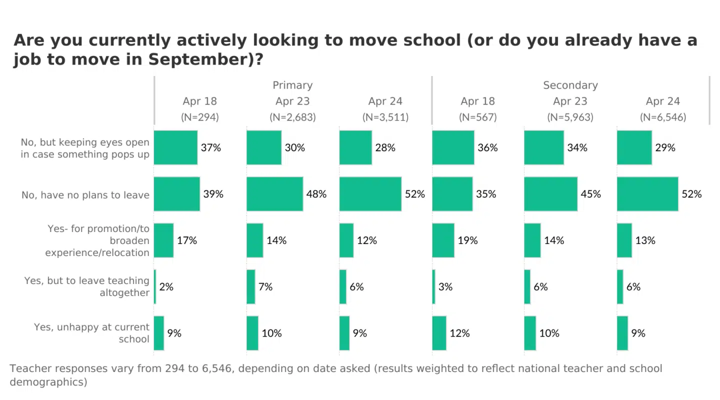 Around half of you are wanting to stay in your school, which is far higher than when we asked in 2018. (Back then it was 39% in primary, 35% in secondary).