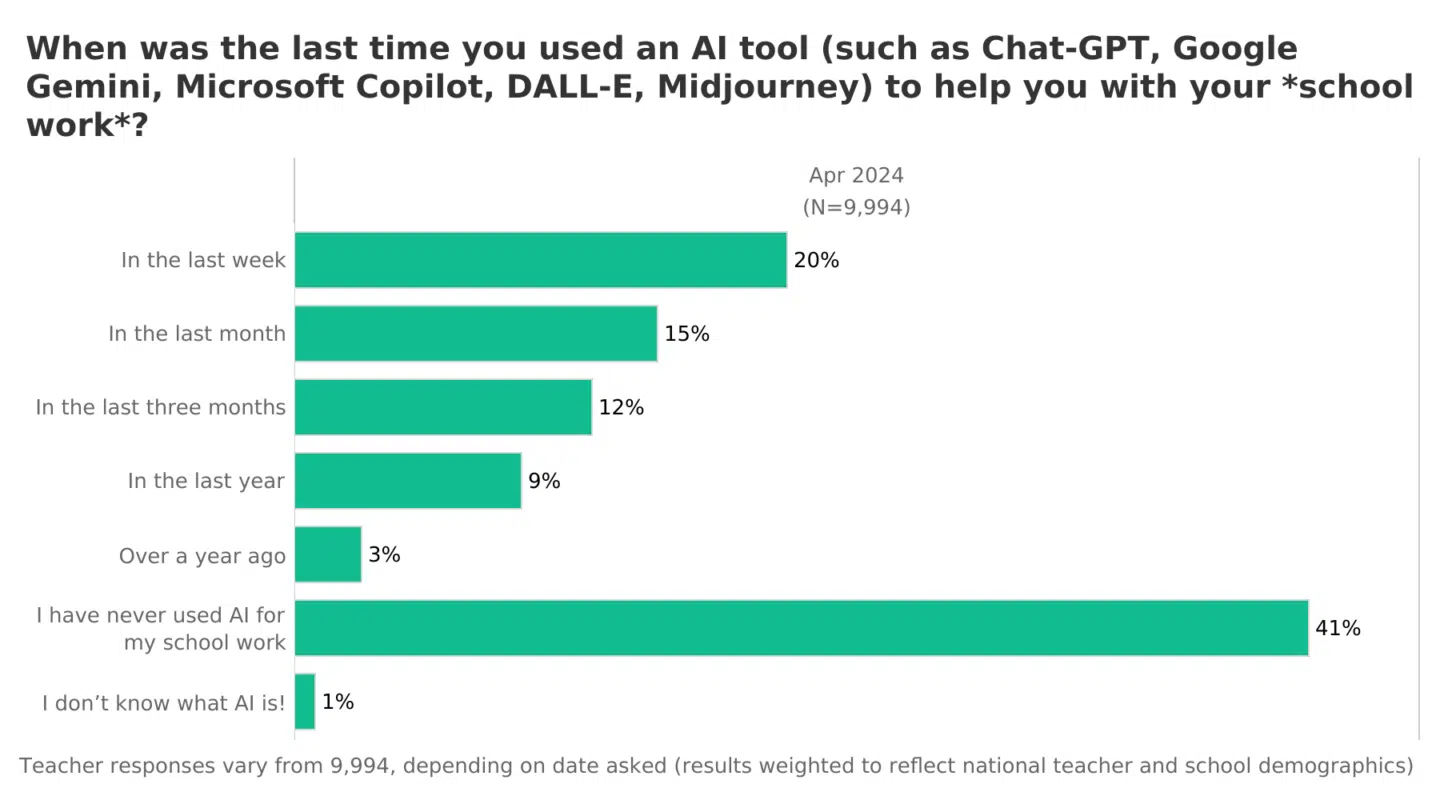 Judging by the numbers – those of you who do use it, use it regularly…whereas those who don’t aren’t finding a use for it. Interestingly, primary school teachers use AI tools slightly more than secondary teachers (21% of primary school teachers use it weekly vs 18% of secondary).