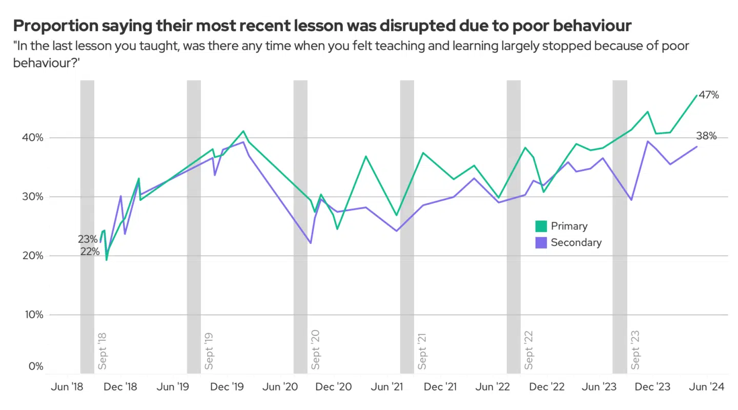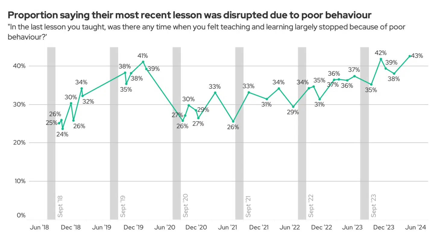 But our most recent ask found 43% of lessons disrupted – the highest percentage since we started asking this question back in 2018.