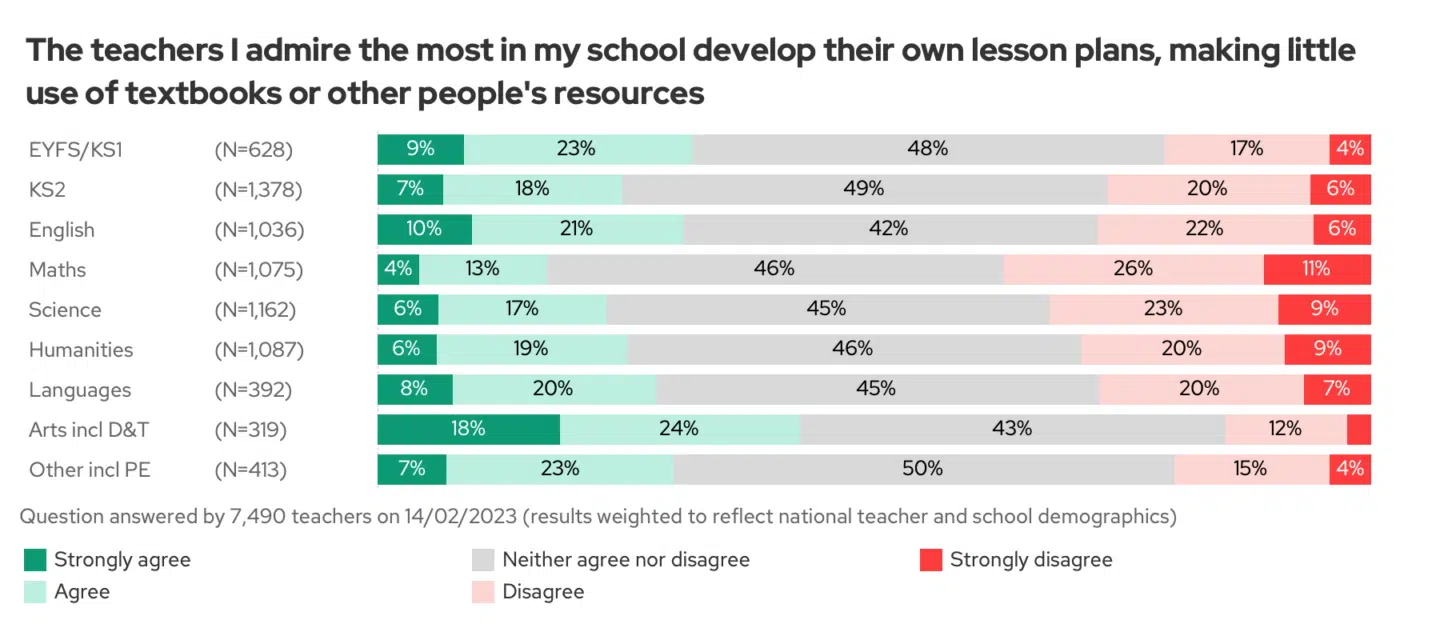 It is certainly the case that the arts and DT teachers are much more likely to express admiration about a teacher who generally uses their own lesson plans, rather than other people’s resources. By contrast, many maths teachers most admire a teacher who typically uses someone else’s resources. Maths is a subject with a very standardised curriculum across schools where there are amazing resources available on many websites.