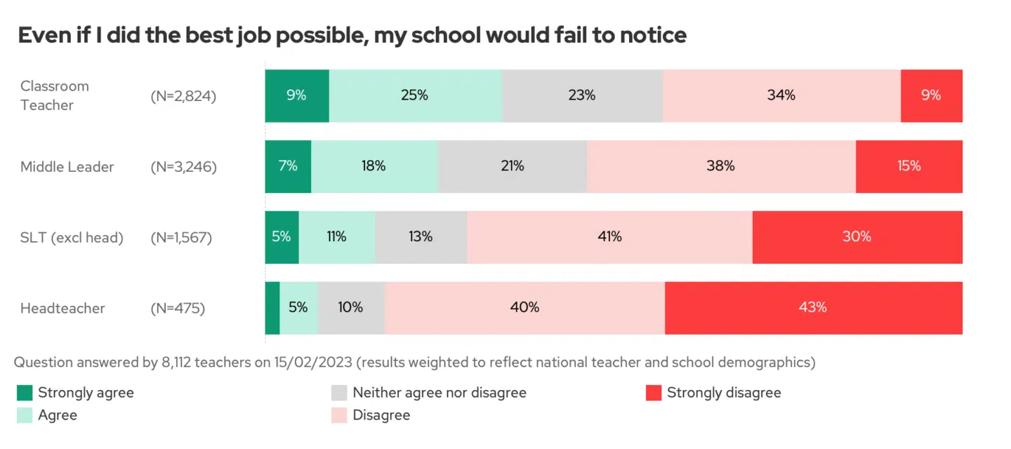 You teach a class and have an amazing lesson with them. Which of your colleagues will notice? Well, nobody of course since you generally teach without other teachers in the room! This makes your job uniquely different to nearly all other professional jobs, and leads to this rather depressing chart. One-third of classroom teachers feel that, even if they did the best job possible, their school would fail to notice. Of course, the figure is much lower for more senior teachers who often visibly work alongside other adults.