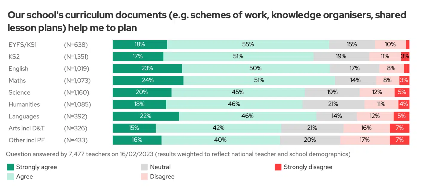 We asked you a lot of questions about planning lessons this week. We know that some of you work in schools with extensive shared planning documents whilst others don’t. But do you find these documents and resources useful? It seems that secondary English, maths and languages teachers are most likely to find them useful , whereas those teaching the very small subjects, such as in the arts, DT, PE and so on, do not. Perhaps this is because your departments are simply not large enough to resource the creation of useful shared documents? Or perhaps your subjects simple do not lend themselves to centralisation of approach?