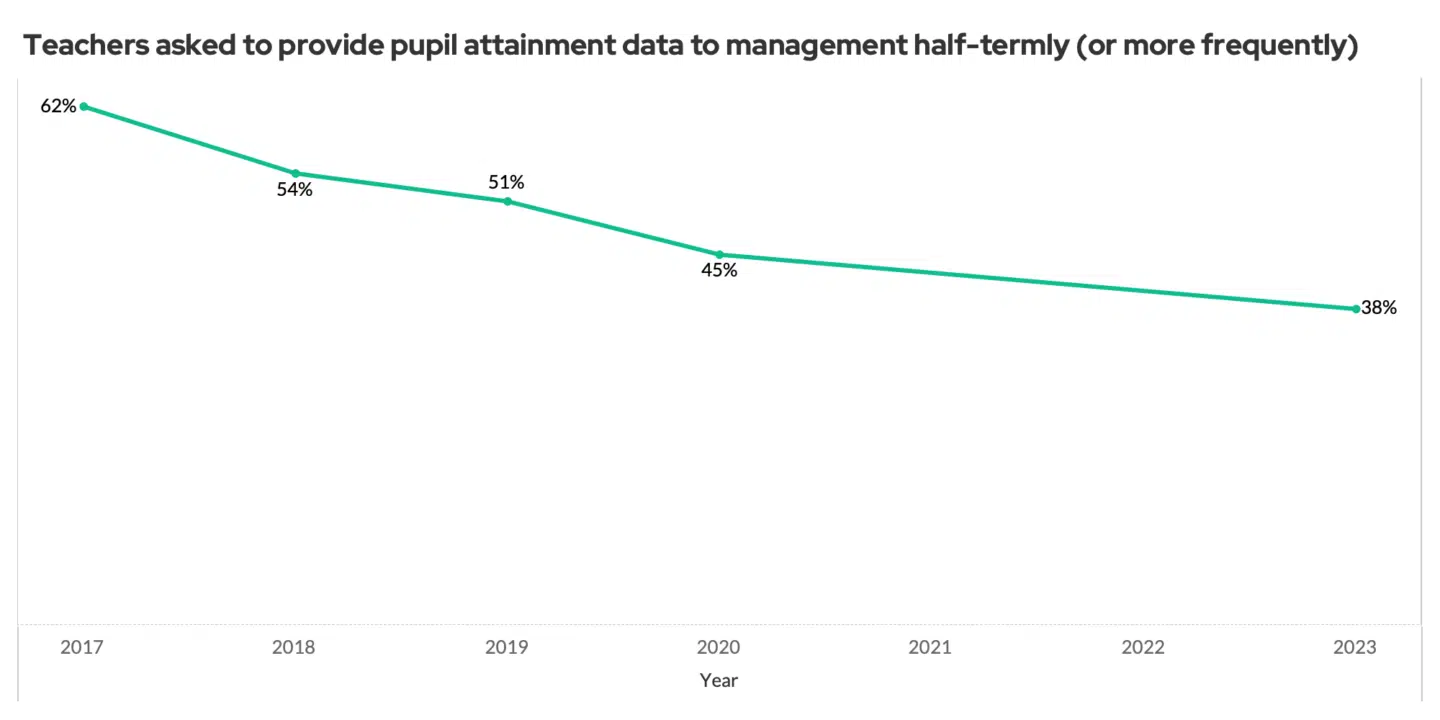 Of course, some things have got better over recent years. The proportion of teachers saying they are required to submit student data six times a year (or more) has fallen substantially – just 4-in-10 are asked to do this, down from 6-in-10 back in 2017.