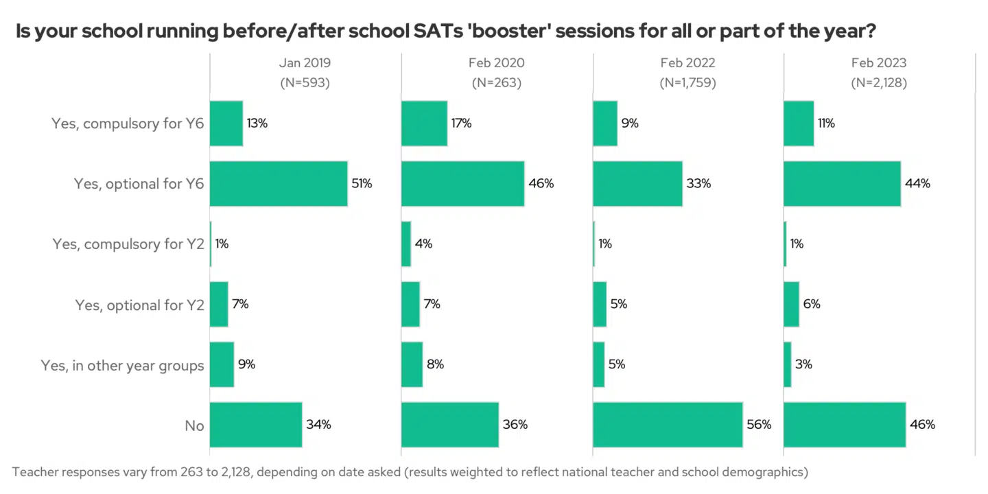 We had hoped the pandemic would help schools shake off some of the added extras that aren’t part of the core job. In primary schools, one example is running extra SATs ‘booster’ sessions – an activity that disappeared in 2020/21 (along with SATs). We saw them start to creep back in early 2022, with 42% running Year 6 boosters. This year the figure has almost returned to pre-pandemic levels, with 55% of primary teachers saying their school would run Year 6 booster sessions.