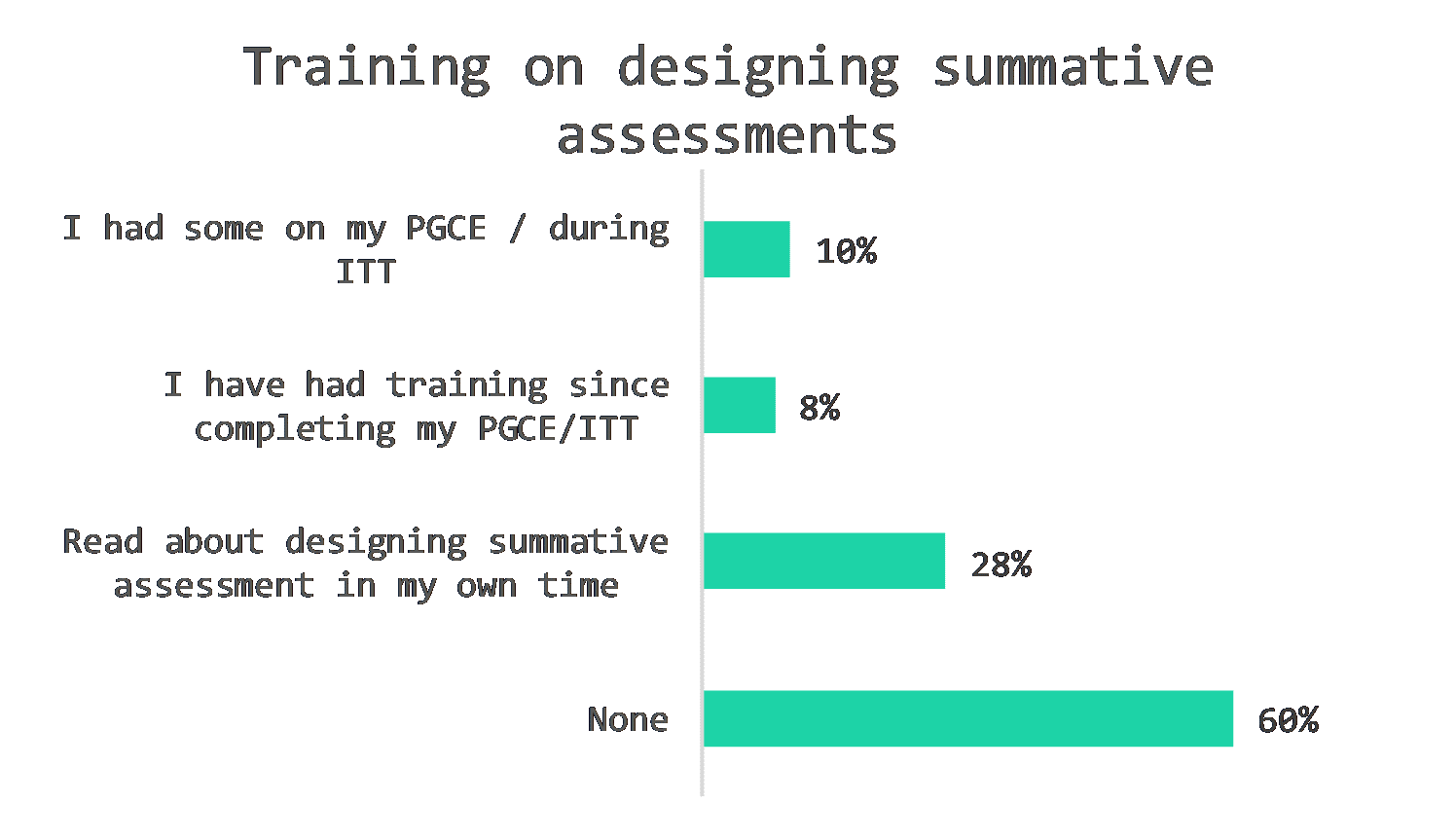 If you’re wondering if the lack of teacher training on summative assessment is a recent thing (i.e. did PGCEs drop this topic at a certain point) then you are not alone. We are thinking about this too and are hoping to answer that question in time.