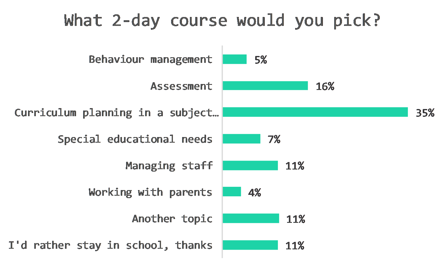 Given free rein to choose any 2-day INSET course, more than a third of tappers picked curriculum planning in a subject as the topic they would most want to learn — far out-stripping any other topic.