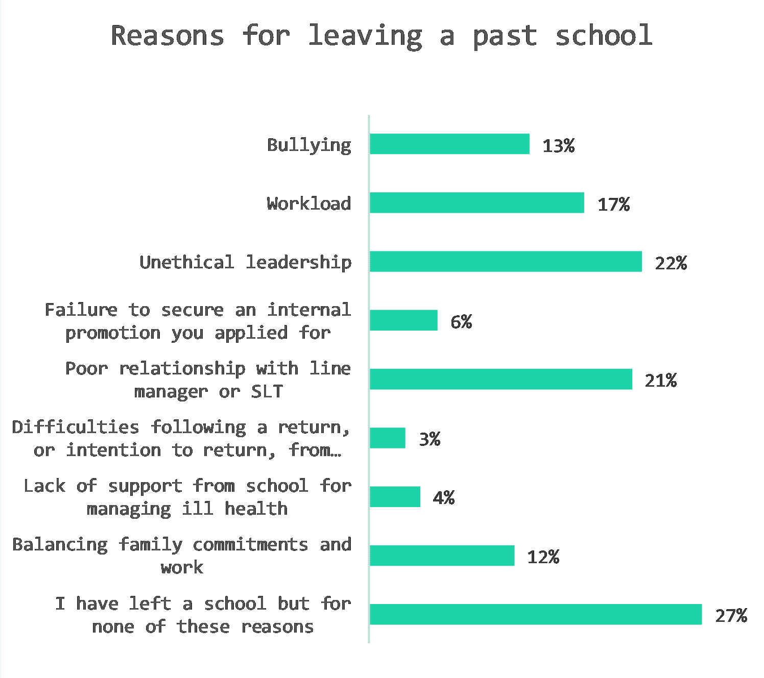 Unethical leadership was the most common factor in people leaving a school (22%). Poor relationships with managers was a close second (21%).