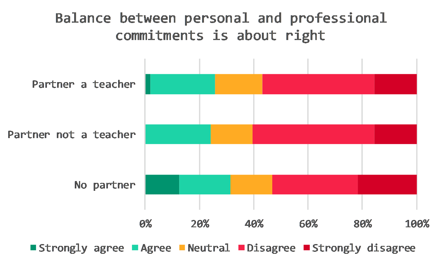 People partnered with a teacher were a touch more likely to agree (or strongly agree) that their personal and professional commitments were positively balanced compared to those whose partner was not a teacher.