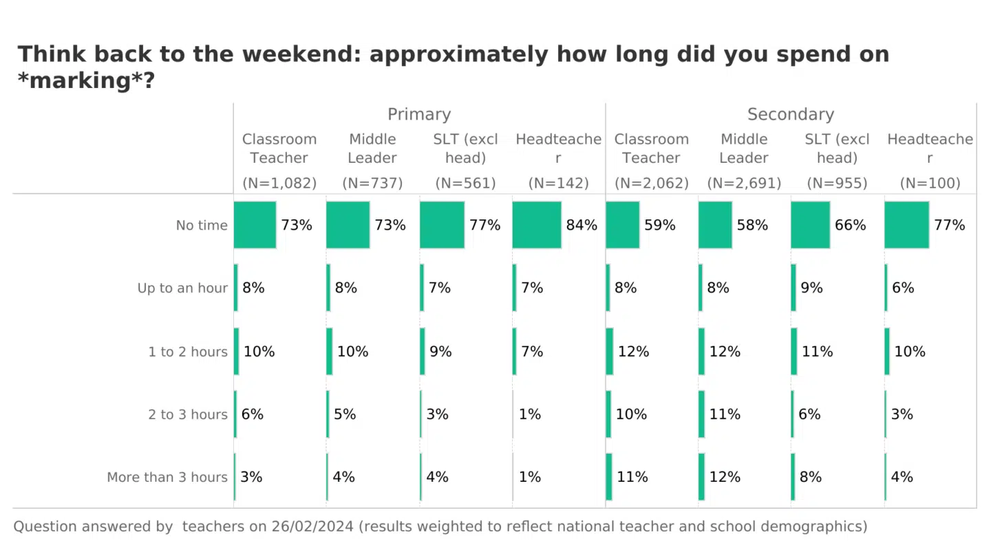 The below chart shows that classroom teachers (versus leaders) clock up more hours on marking (no surprise there), and last weekend secondary teachers were slightly more likely than primary colleagues to spend over 3 hours marking.