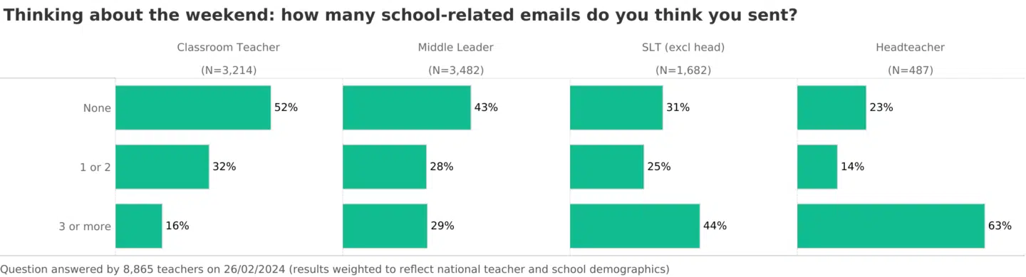 Here we see a different story; although headteachers can keep their red pen in the drawer, 63% of heads sent three or more emails over the weekend.