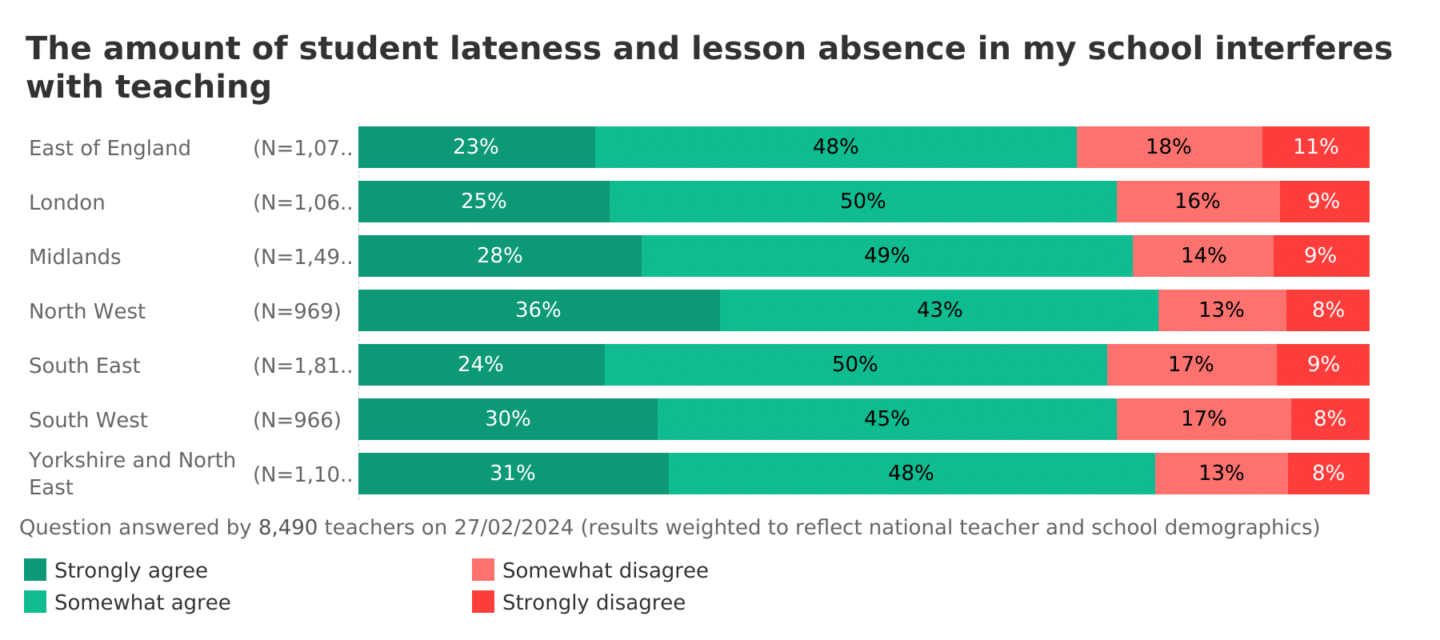 Those of you teaching in the North West were more likely to ‘strongly agree’ that absence is interfering with teaching compared to those in the East of England or South East – with 36% strongly agreeing in the North West compared to just 23% in the East of England.