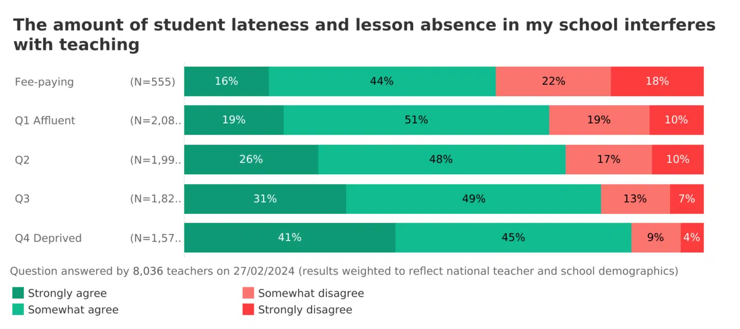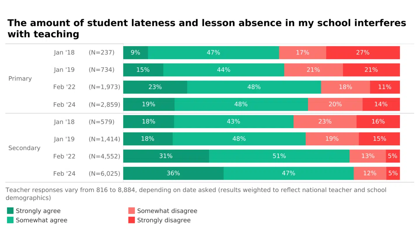 In 2017, only 18% of secondary teachers strongly agreed that student lateness and absence interfered with teaching; today it is 36%, a dramatic increase.