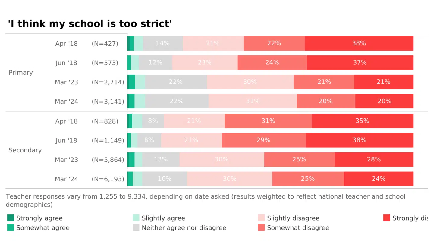 Back in 2018, 28% of primary teachers and 25% of secondary teachers strongly disagreed their school was too strict. Now the percentages are 20% and 24%. This suggests that schools have potentially become stricter in their approaches, compared to 2018, or have teacher expectations mellowed?