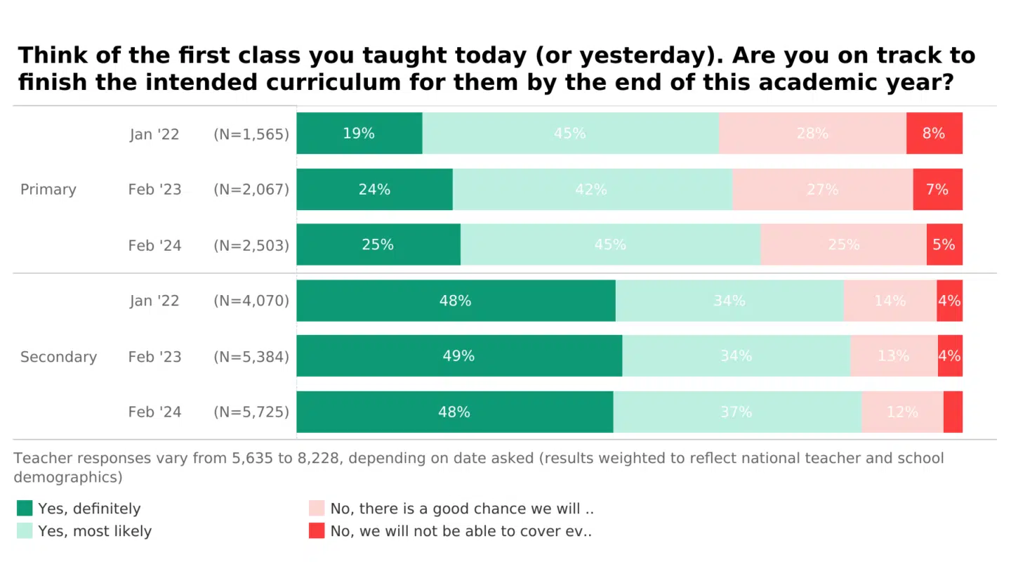 However, when we break this down into primary and secondary – we can see it’s primary teachers who worry the most about squeezing the notoriously overpacked primary curriculum in. 30% of you in primary school teachers have concerns about finishing, compared to just 15% in secondary.