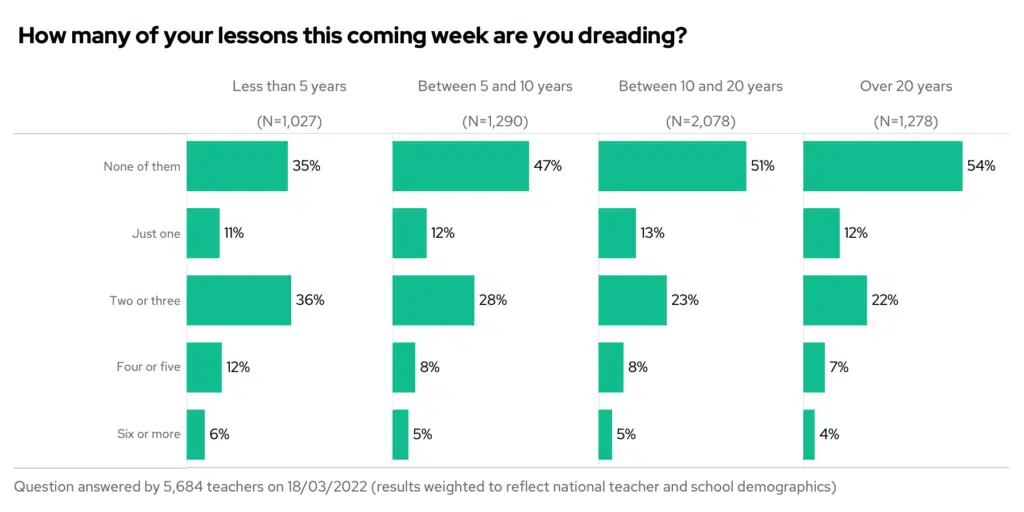 On the upside, things do get better! Only one-in-three teachers with more than 20 years experience are dreading more than two lessons this week.