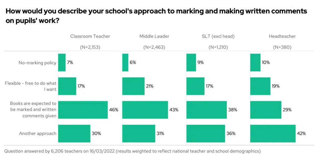 Again, 46% of classroom teachers say that books are expected to be marked with written comments, but only 29% of heads agree – instead saying their school has “another approach”.