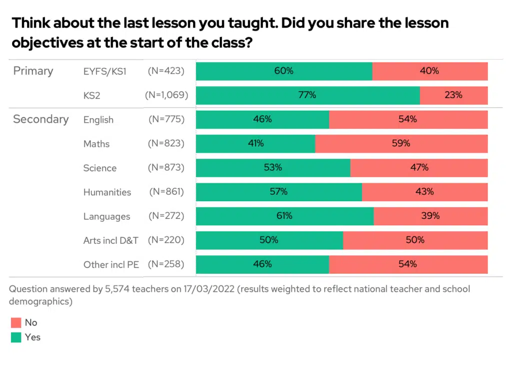 In particular, primary schools are keen on lesson objectives – with 77% of KS2 teachers sharing at the start of their lessons.
