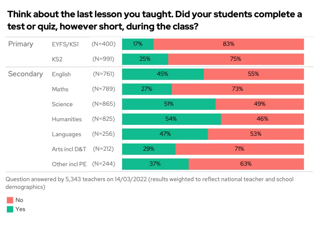 Only 27% of maths teachers said their students completed a test or quiz in their last lesson, compared to 45% of English and 51% of science teachers.