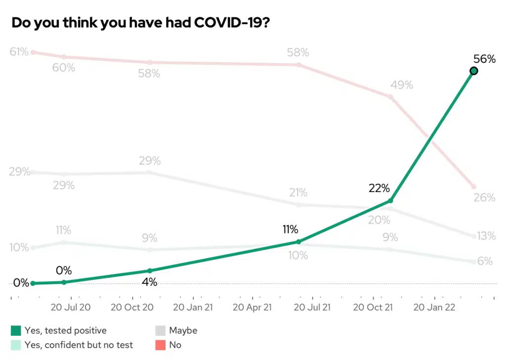 For example, this week 56% of you reported that you have ever tested positive for Covid-19 – far higher than when we last asked in November 2021!