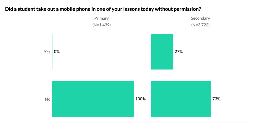 On an average day, 0% of primary schools teacher deal with a student using a mobile phone in a lesson without permission. For secondary teachers, the number was 27%, which was a drop from 38% when we last asked this question in May. Are schools already clamping down?!