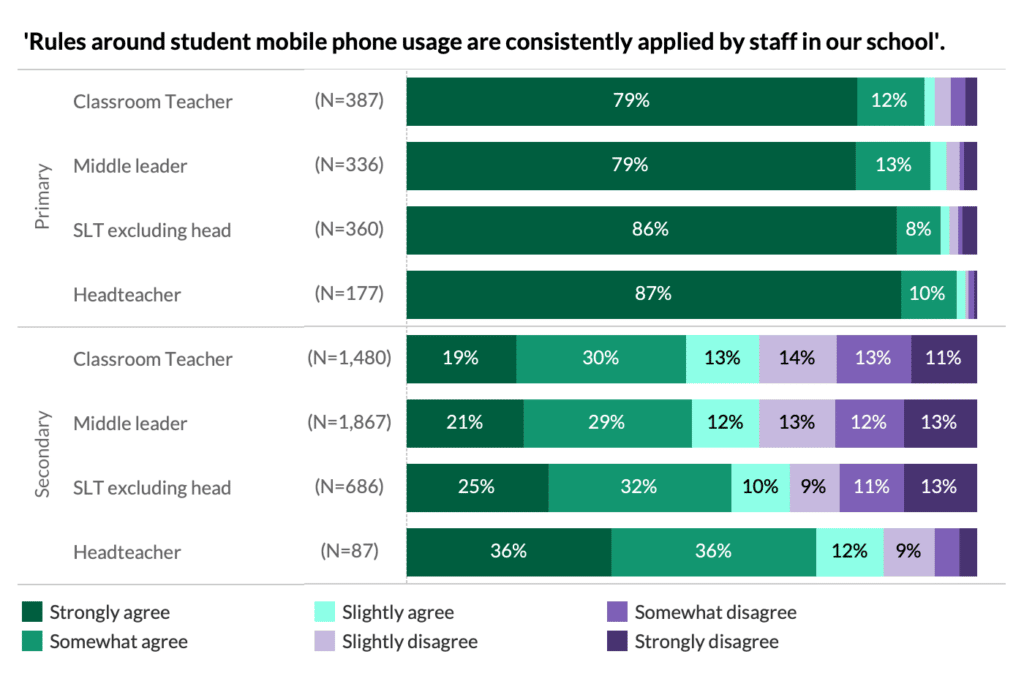 There appears to be a difference in beliefs that mobile phone rules are consistent within schools. 80% of secondary heads believe that rules are applied consistently. This view isn’t always shared among classroom teachers, where this number drops to around 60%.