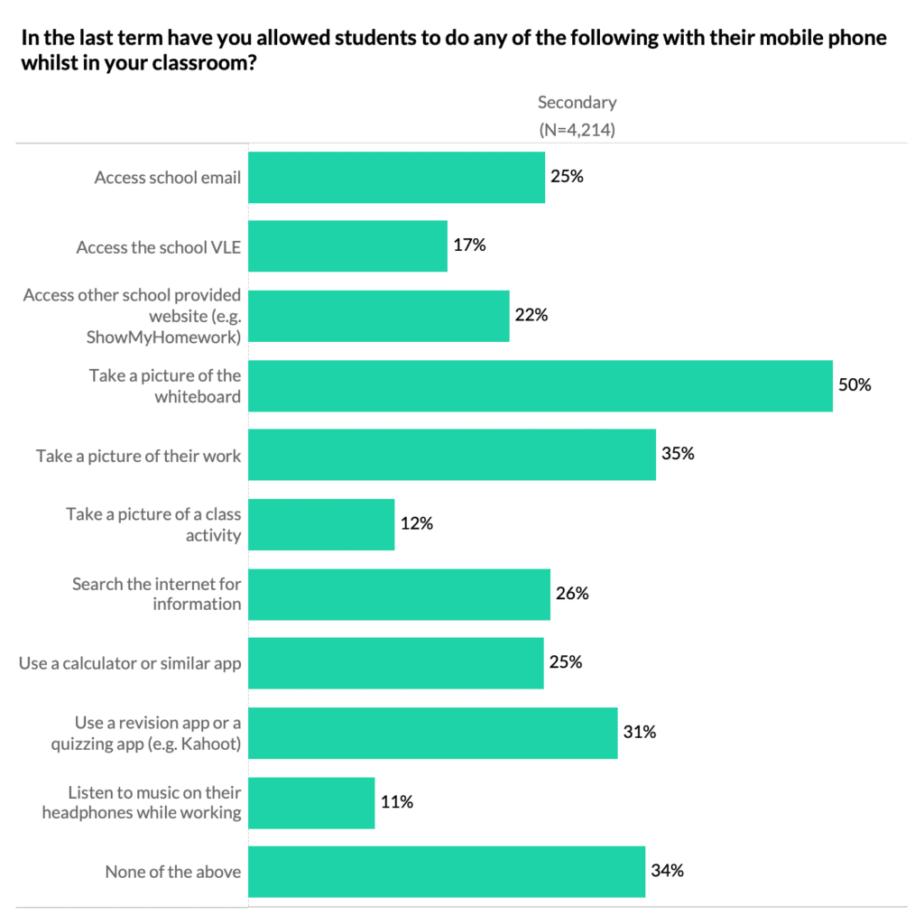 What for? Mainly taking pictures of the whiteboard! Half of you allowed pupils to snap the board and a further 35% allowed pictures of pupil’s work. Revision and quizzing apps were also popular with 31% of teachers allowing phone use for these.