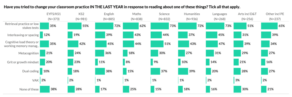 BUT Dual Coding is becoming more popular, particularly in English, Science and Humanities. Maths teachers were less likely to use it. But then, they were less likely to use all of the improvement changes. Retrieval practice and low stakes testing remain popular – with even 51% of Arts teachers saying they were trying it out this year.