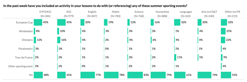 The Euros are just one of many sporting events this summer. Don’t forget the Olympics start soon! Many of you have already used the European Championships as an activity in your lesson – especially those in the primary sector, as well as languages and PE teachers. For languages teachers, the Tour de France provided inspiration for 10% of you in your lessons. Vive le velo!