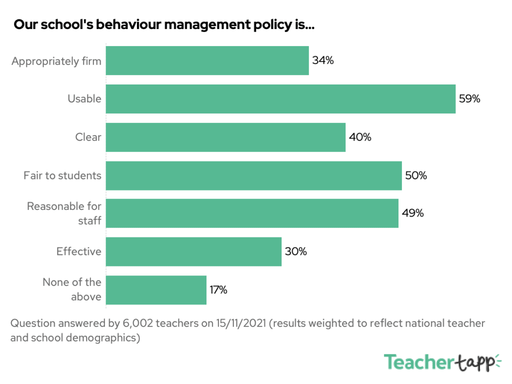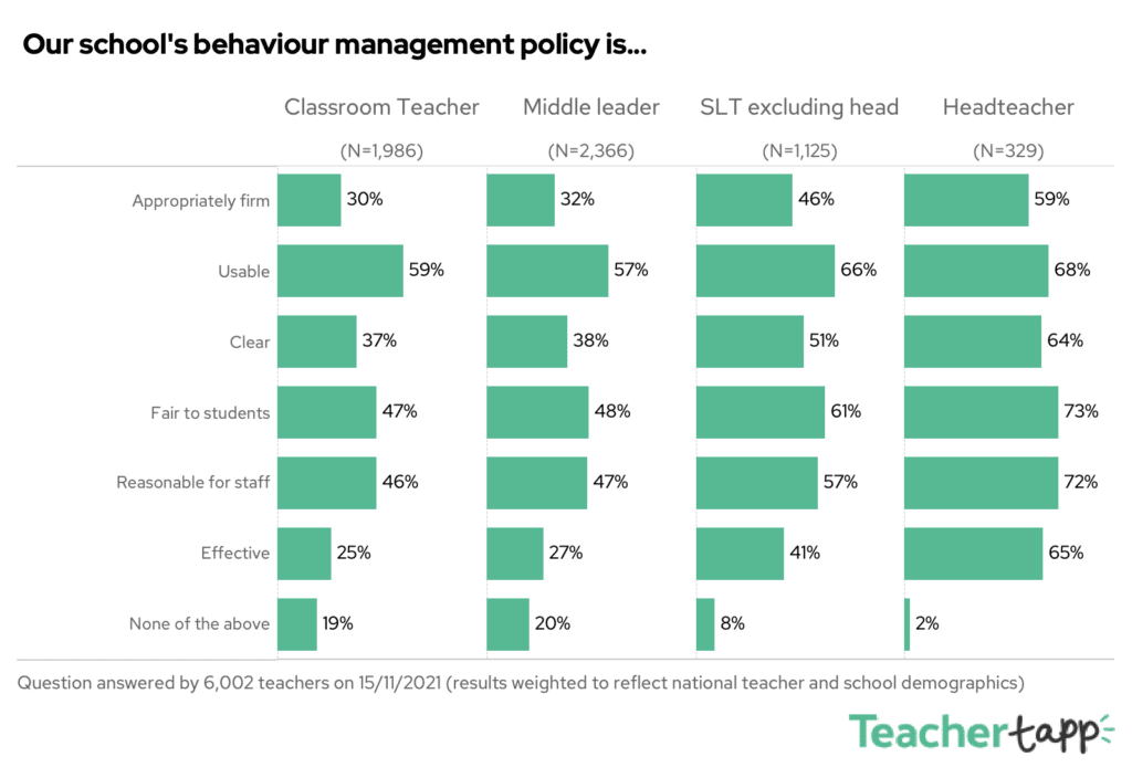 There were some interesting disagreements between classroom teachers and heads, though 👀. Most notably, only 25% of classroom teachers reported that their behaviour policy was effective, compared to 65% of heads. Furthermore, only 37% of classroom teachers reported that their policy was clear, compared to 64% of heads.