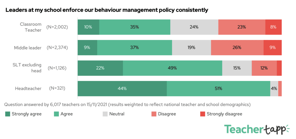 The disagreements continued between classroom teachers and heads in the implementation of their policies. While 95% of heads and 71% of SLT thought behaviour policies were consistently enforced, this view was not shared among classroom teachers or even middle leaders, where less than 50% thought the same.