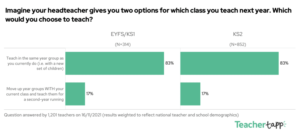 An equivalent question was asked to primary teachers, but there was no such disagreement among them. 83% of both EYFS/KS1 and KS2 teachers were in favour of teaching the same year group year on year. It’s likely a similar argument applies here as to English teachers – whereby teachers have prepared the resources for their year group. (And, of course, they spent every hour of every day with a class, so maybe it is time for both sides to move on!)