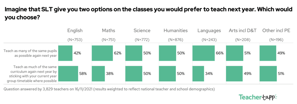 However, nearly two-in-three Maths and Languages teachers were in favour of remaining with their current group and teaching them again, whereas the opposite was true for English teachers, where there was a majority who would prefer to stick with the current curriculum.