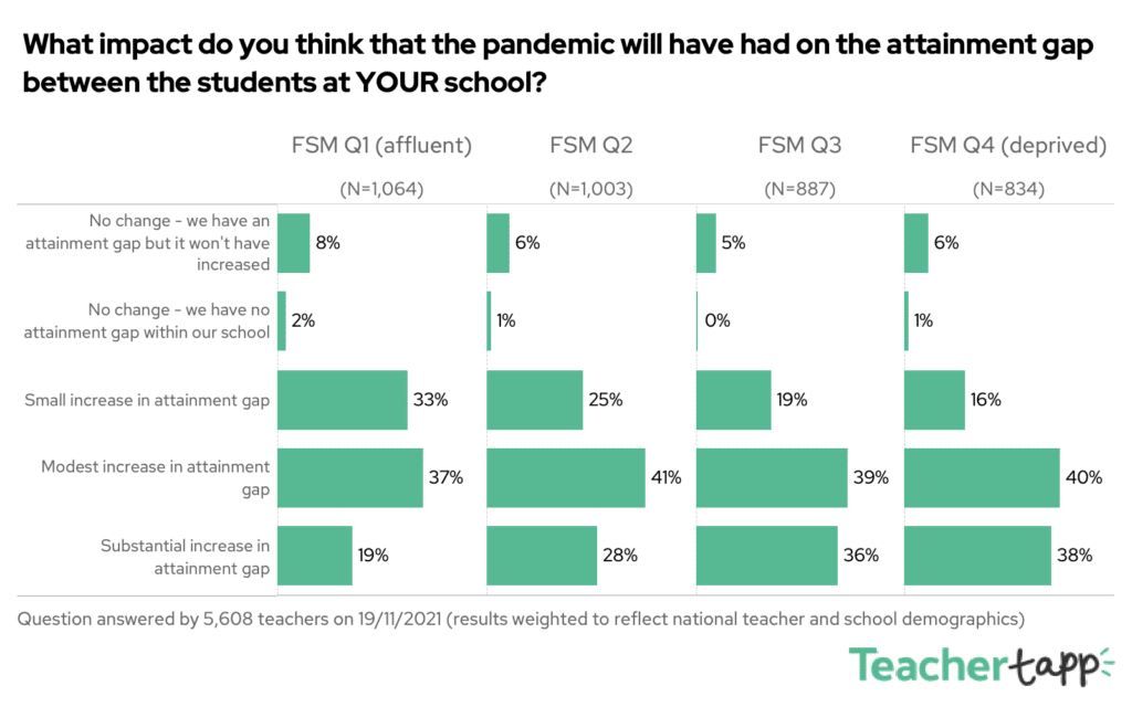 What about its effect on students and the attainment gap? Around 90% of you are in agreement that the attainment gap has increased because of the pandemic. However, its teachers in the most deprived schools who fear the gap has grown the most. 38% of teachers in FSM Q4 schools said that there was a substantial increase in the attainment gap, compared to 19% of those in FSM Q1 schools.
