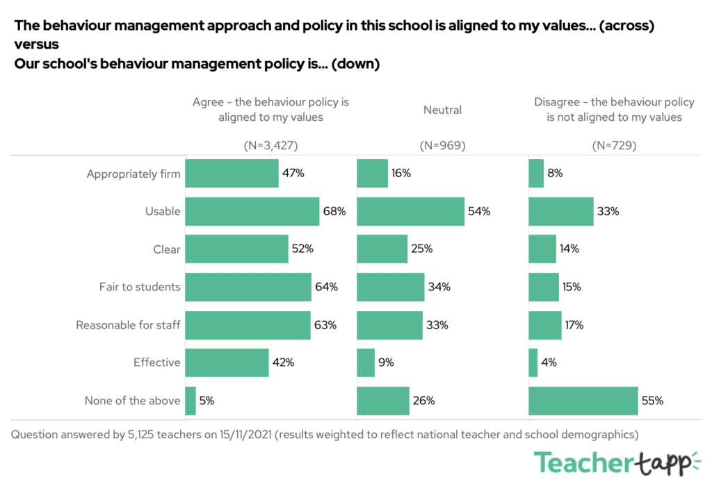 55% of teachers who say that their policy does not align with their values do not think that the policy is effective, clear or fair. This only applies to 5% of teachers who say that the policy does align with their values.