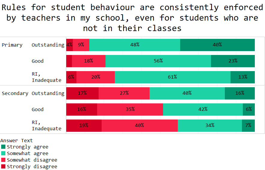 And teachers who work in Outstanding-rated schools were the most likely of all to say the rules were consistently upheld by staff.